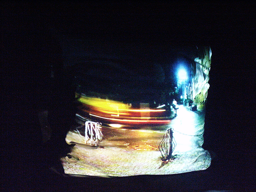Zwei synchron laufende Filme werden auf zwei weisse Kopfkissen projiziert. Eine nächtliche "Kamerafahrt" durch die Saarbrücker Straßen ist zu sehen - als würde man gleichzeitig durch die Frontscheibe und durch die Heckscheibe eines Autos schauen.