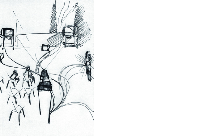 Die große Projektionsleinwand ist statisch, die kleineren Bildträger wechseln ihre Position im Raum. Der große Monitor steht auf einem Magazinwagen, auf dem auch der zweite Projektor befestigt ist. Den Wagen kann ich schieben oder vor mir her ziehen. Den kleinen Monitor trage ich durch den Raum, um seine Position zu wechseln Alle Abspielgeräte befinden sich in der Mitte des Raumes in der Nähe des Projektors. Zu den anderen beweglichen Geräten führen lange Netz- und Signalkabel. Zwei Bildebenen sind gleichzeitig bespielt, zum Teil nur ausschnittsweise. Das Gesamtbild verändert sich im Laufe der Performance ständig. Die Bänder sind sehr präzise aufeinander abgestimmt. Meine Bewegung folgt einer sehr strengen Choreografie.